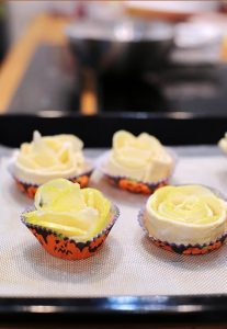 4.- Colocamos cada flor sobre una cápsula de magdalena y éstas a su vez sobre cada cavidad de un molde para magdalenas.