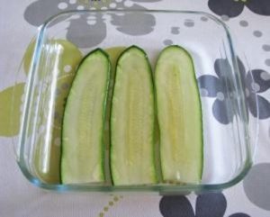 Coloca las tiras del calabacín por toda la base de un recipiente apto para el microondas (yo he utilizado uno de pyrex), si quieres puedes poner dos capas de forma perpendicular para que la base cubra más.