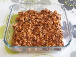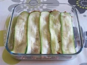 Añade el relleno de la carne picada por toda la superficie del calabacín hasta cubrir todo el recipiente.