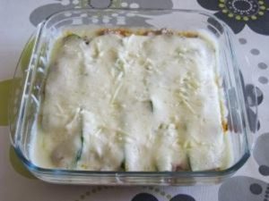 Coloca otra capa de tiras de calabacín para cubrir el relleno.