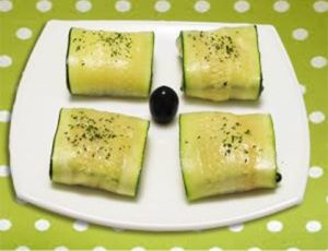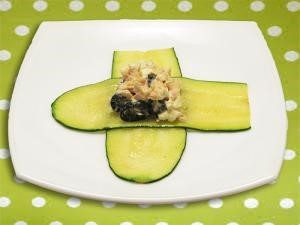 -Coloca las tiras de calabacín de dos en dos en un plato con forma de cruz y pon una cucharada del relleno en el centro.